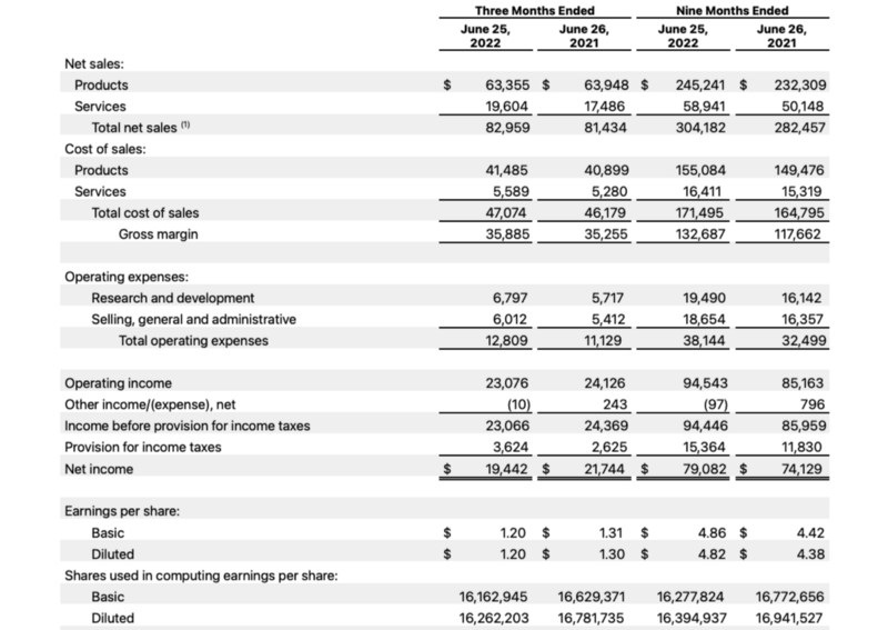 The following screenshot captures the headline numbers from Apple’s most recent quarterly release (https://www.cnbc.com/2022/07/28/apple-aapl-earnings-q3-2022.html):